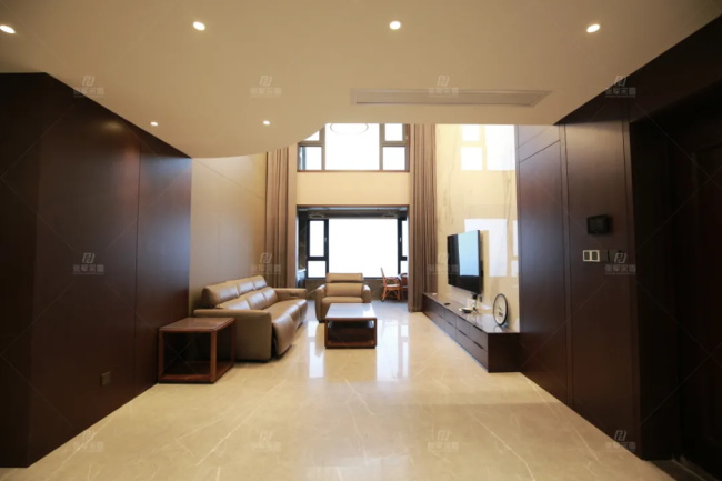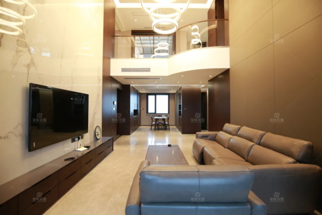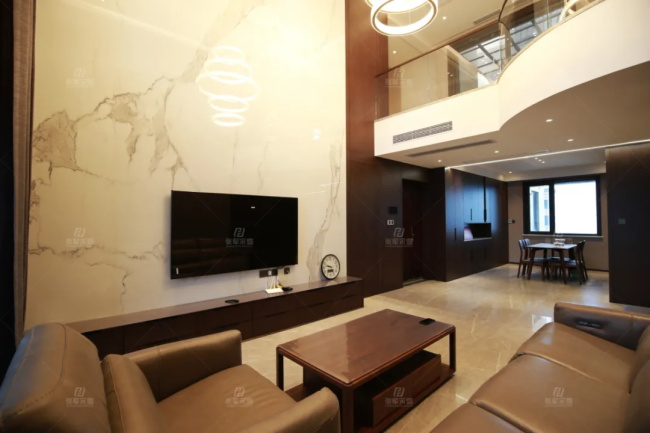 客廳是挑高空間,平頂+加減樓板做一個半圓弧的鋼琴造型,讓整個空間如鋼琴的音色般單純而豐富。電視墻利用石材+木飾面板做一體造型,沙發背景硬包分割,再結合皮藝沙發,靈動感與舒適度密切交疊,精致又細膩。