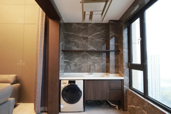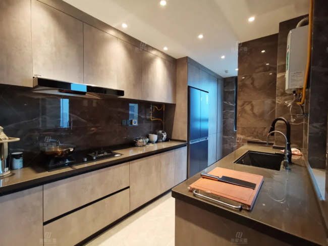 隱形門后的廚房,雙一字型設計,冷暖相融的材質,玲瓏剔透的花紋,簡潔立體的櫥柜,是業主對品質感的精尚追求。