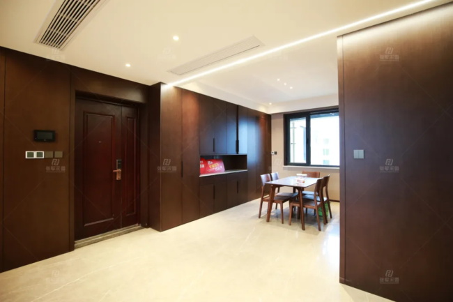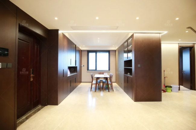 入戶正對樓梯,走廊即客餐廳分區。設計師利用廚房門做隱形設計,打造一整面墻的玄關柜,來滿足入戶穿衣戴帽的需求。