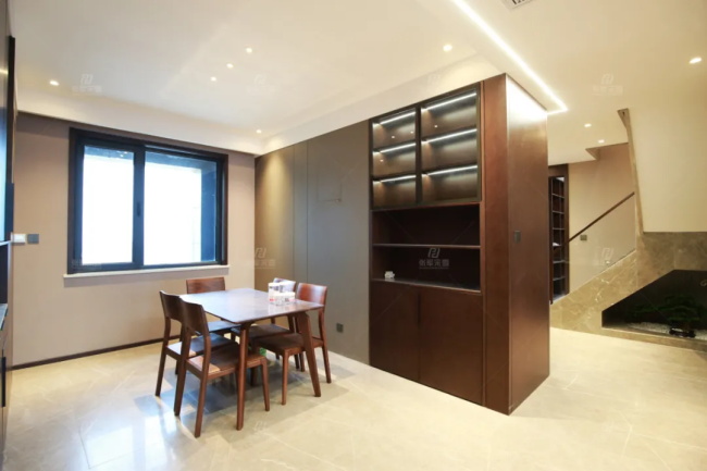 餐廳,是純粹的木質宣言,墻面木飾面板與酒柜組合,再融合木質餐桌椅,描繪出一幕至臻高貴的家庭生活情景。