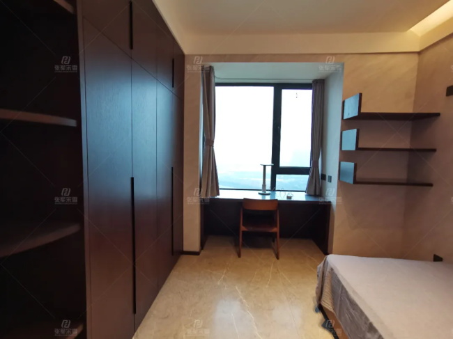 書房門隱藏在電視墻背景中,臨窗放置辦公桌,墻上做置物架,加班的同時還能觀賞風景,放松眼睛。業主把書房做了雙功能空間,一張床一面衣柜,簡單生活。