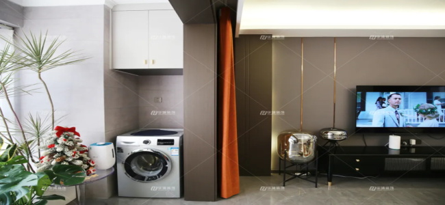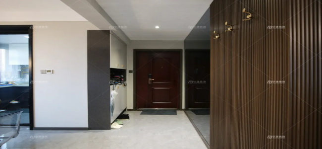 入戶做了一組三段式玄關柜,嵌入感應燈帶,有人在就會一直有光亮。還有一個咖色的穿衣鏡,不僅可以整理妝容,還能在視覺上延伸空間。再進來是小格柵包角設計的掛衣區,很別致。