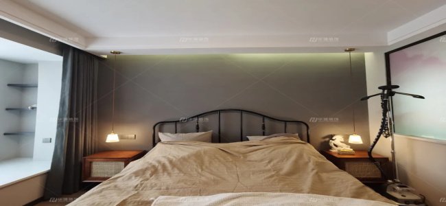 主臥最大的亮點在于儲物,一整面墻的衣柜,可以把心愛的衣服包包全部收納。在燈光的處理上,設計師以“見光不見燈”的構思布局,不管是聊天、看書還是起夜,燈帶里的光亮都會滿足你的需求,還不至于晃眼。