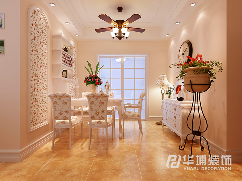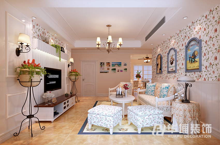慣用了風格里面的特點 上墻碎花壁紙 下墻白色墻板 和客廳的正面起到呼應的效果沒有過多華麗的造型 后期加以軟裝掛畫作為點睛。