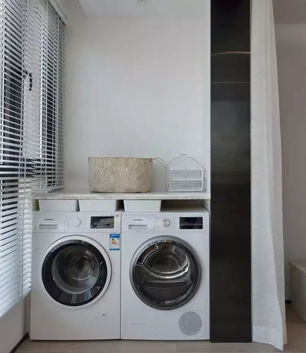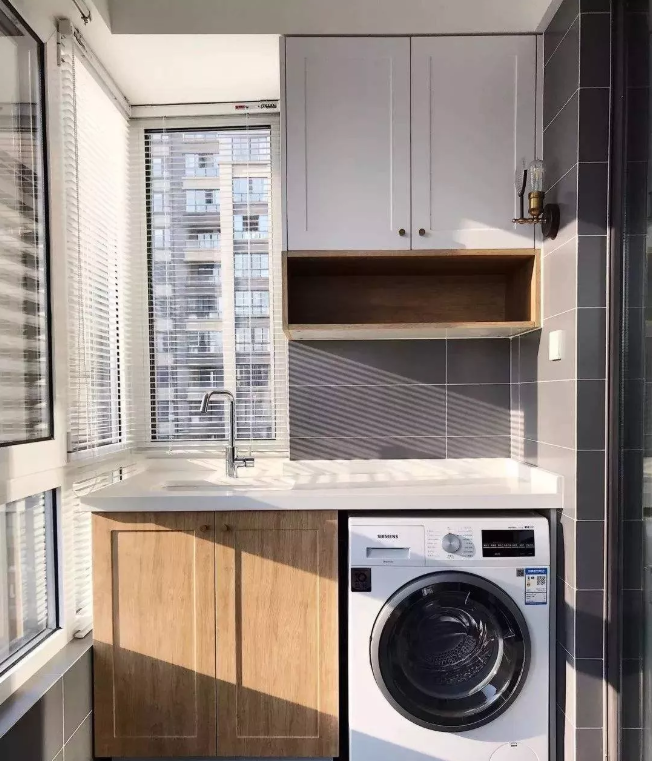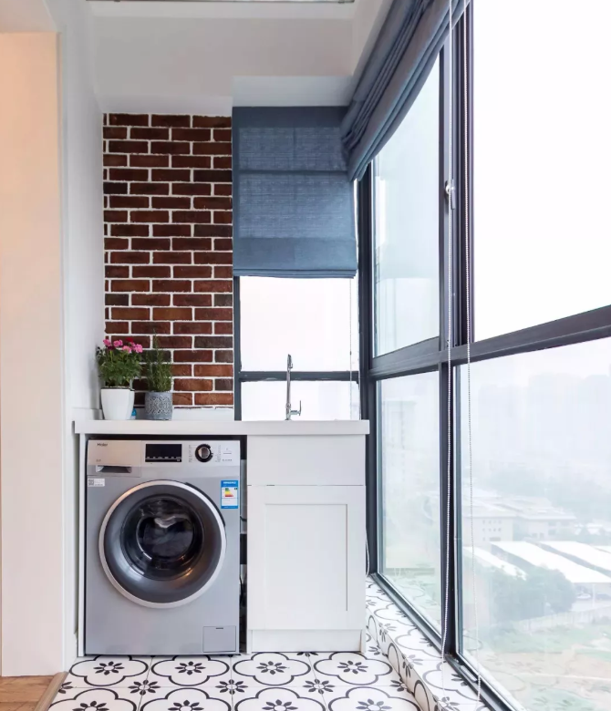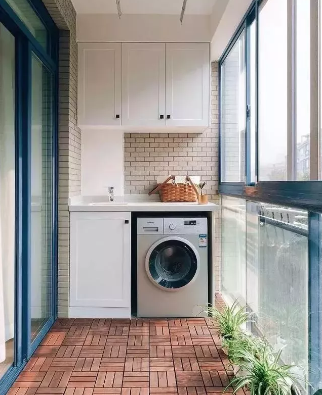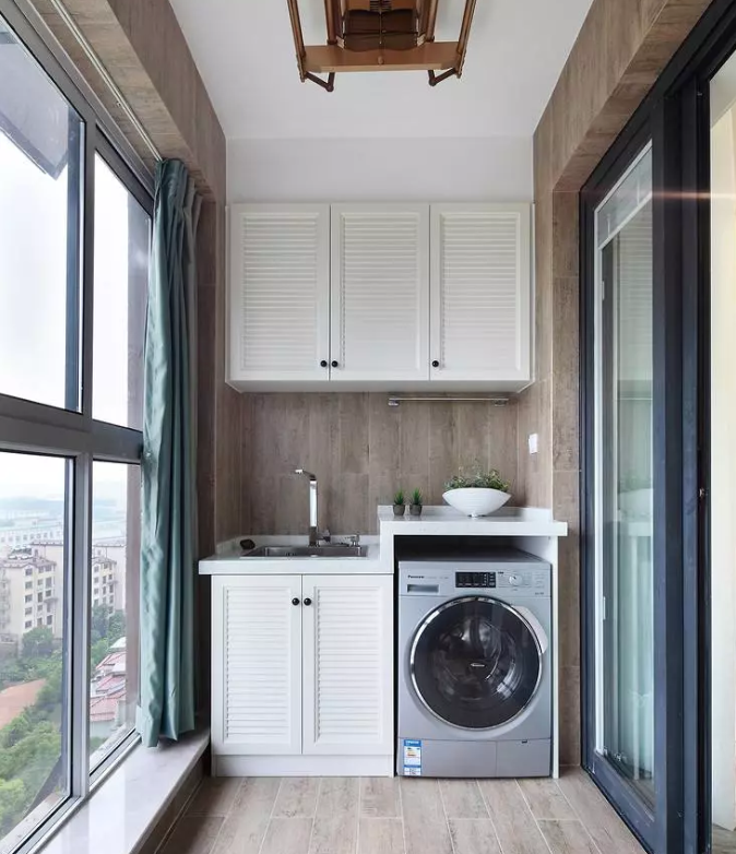6.一般陽臺日曬都比較嚴重,這時候要做好防曬工作,保證洗衣機使用壽命,洗衣柜盡量不要做木質的,最好選擇磚砌一個,更耐用;還可以在陽臺上裝上窗簾,避免陽光直曬。