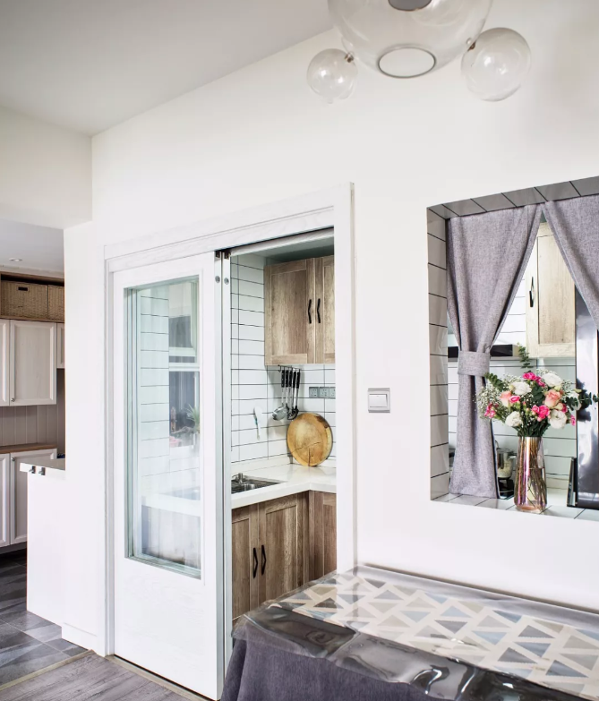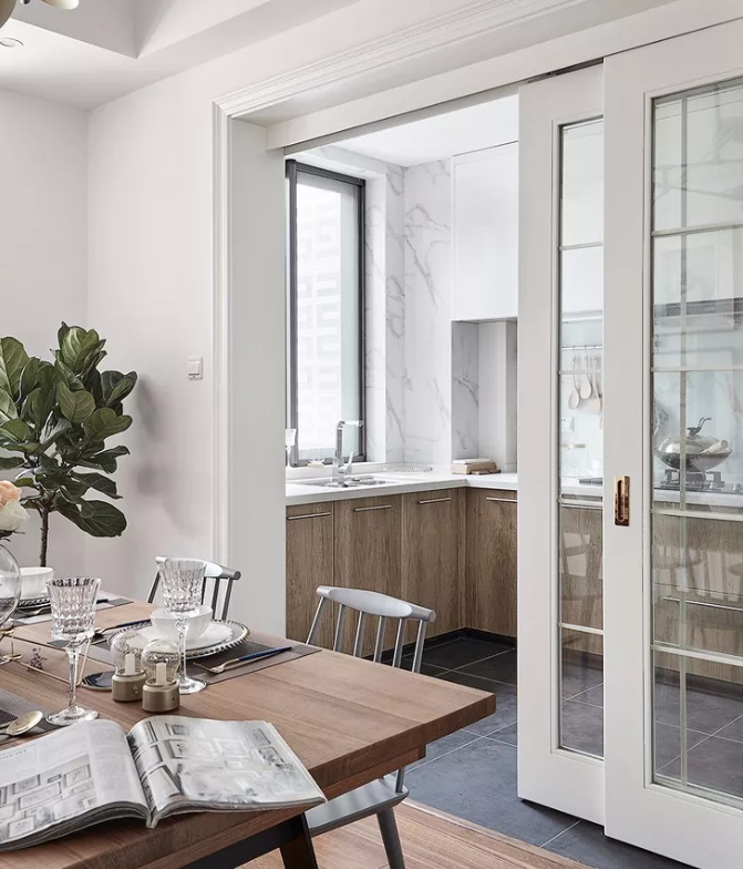 推拉門靈活隔開兩個空間,沒有了傳統木門的厚重與封閉,更顯時尚與透亮。餐廳與廚房隔而不斷,還能有效地防止油煙。