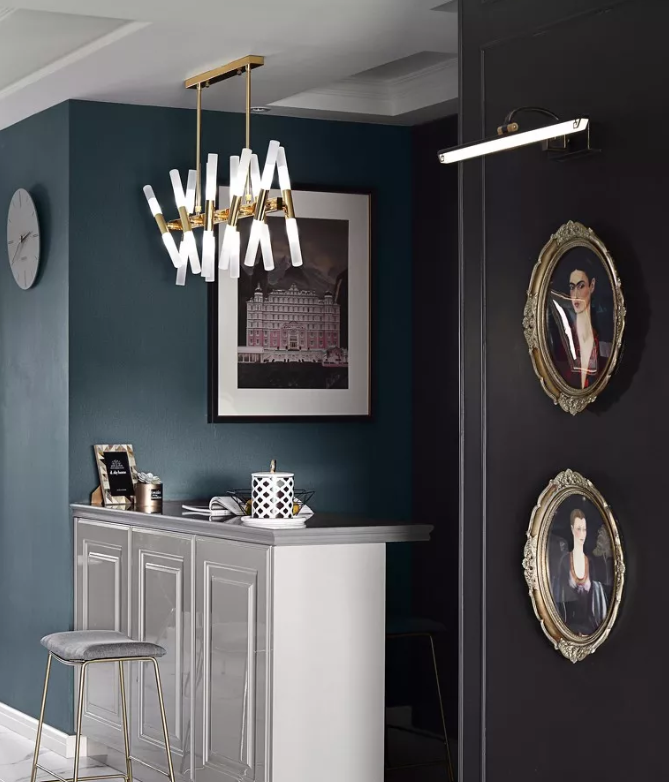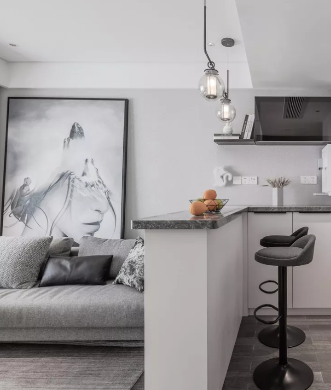 有些開放式餐廳也與客廳相連,做一個造型簡單大方的吧臺隔斷,或放置一個酒柜,也不失為一種經濟實用的設計。