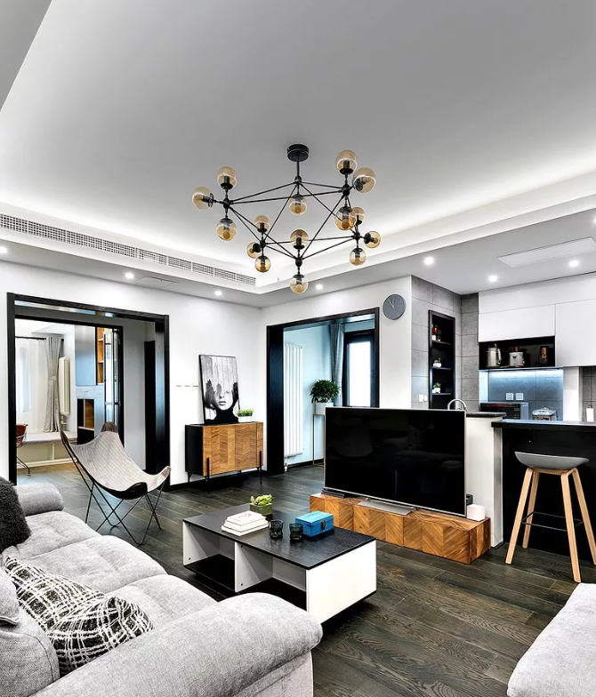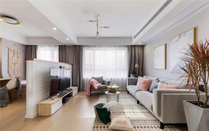 電視墻形成的隔斷時尚感十足,讓人眼前一亮。這種隔斷輕巧實用,還能節約客廳面積。