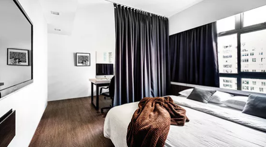 作為一種軟隔斷,色澤漂亮的簾幕可將臥室分割成幾個不同機能的小空間。如需要,布簾隔斷就可以任意開啟,是彈性隔開臥室睡眠空間和公共空間的理想形式。