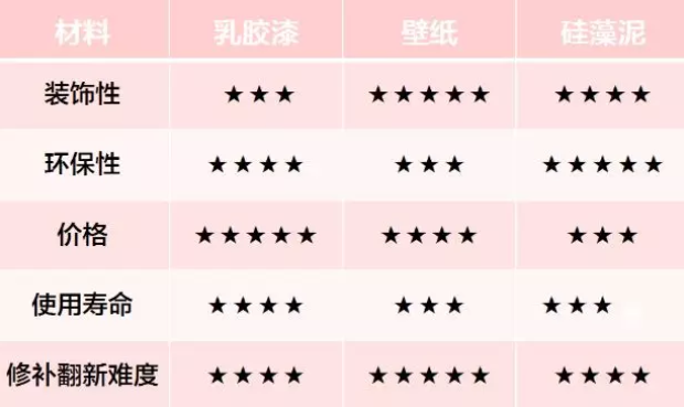 環(huán)保性上,硅藻泥>乳膠漆>墻紙。