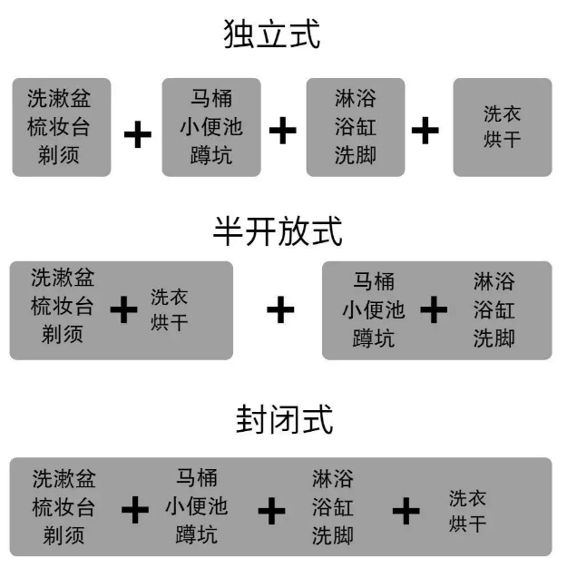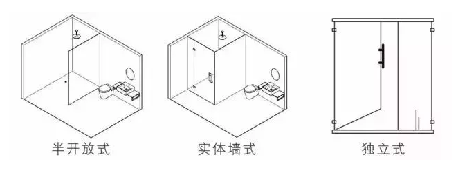 衛生間劃分為3種常見的形式。其中,封閉式衛生間最適合面積小的衛生間,但是封閉式衛生間大多數都是不得已而為之,每個功能區不是獨立的,使用很麻煩。
