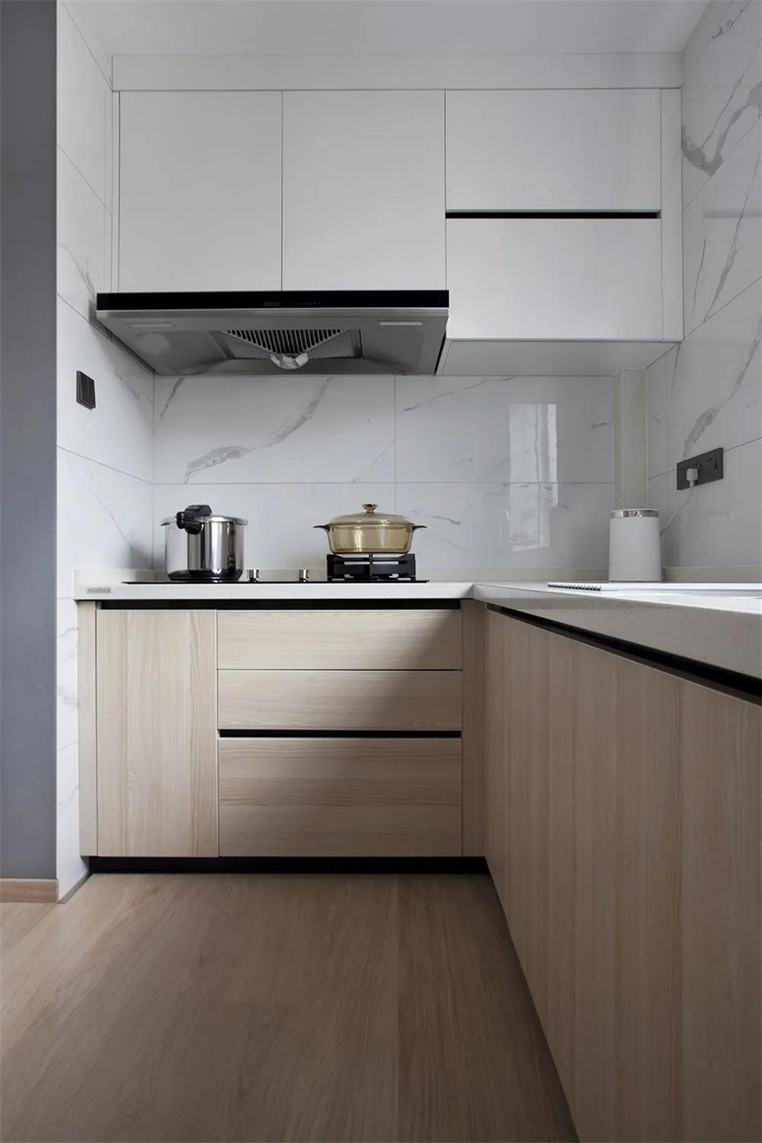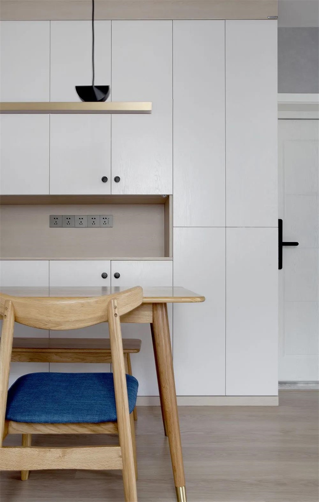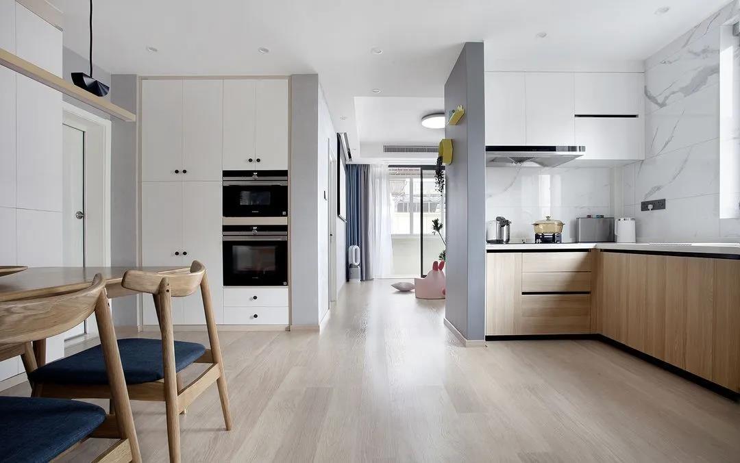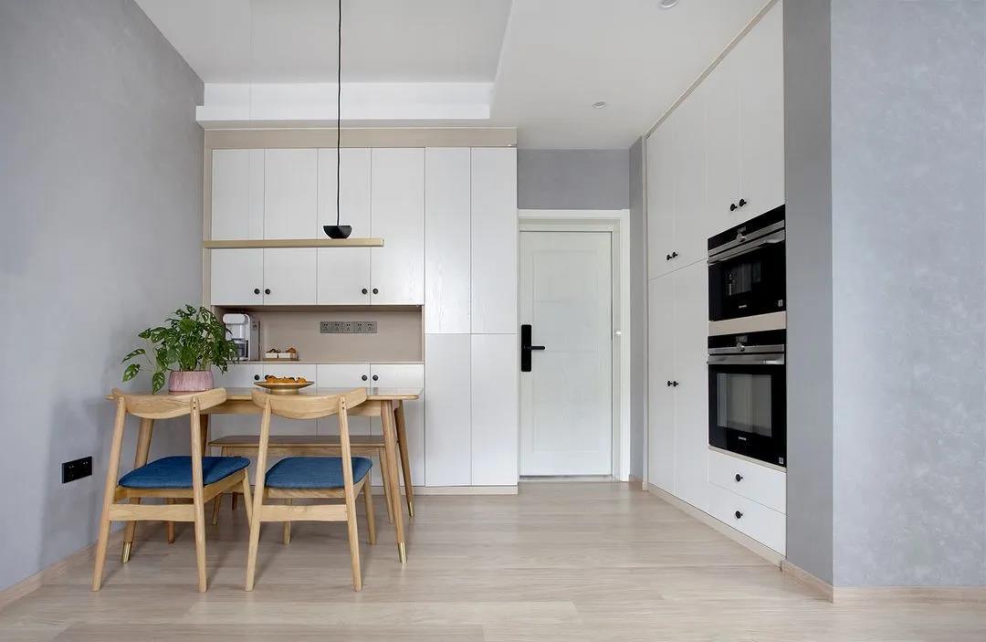經(jīng)過(guò)玄關(guān)就是餐桌,用高柜做隔斷,也方便收納。餐廳一側(cè)做全墻式收納柜,烤箱電器做鑲嵌收納處理,不占位置,更加美觀簡(jiǎn)潔。