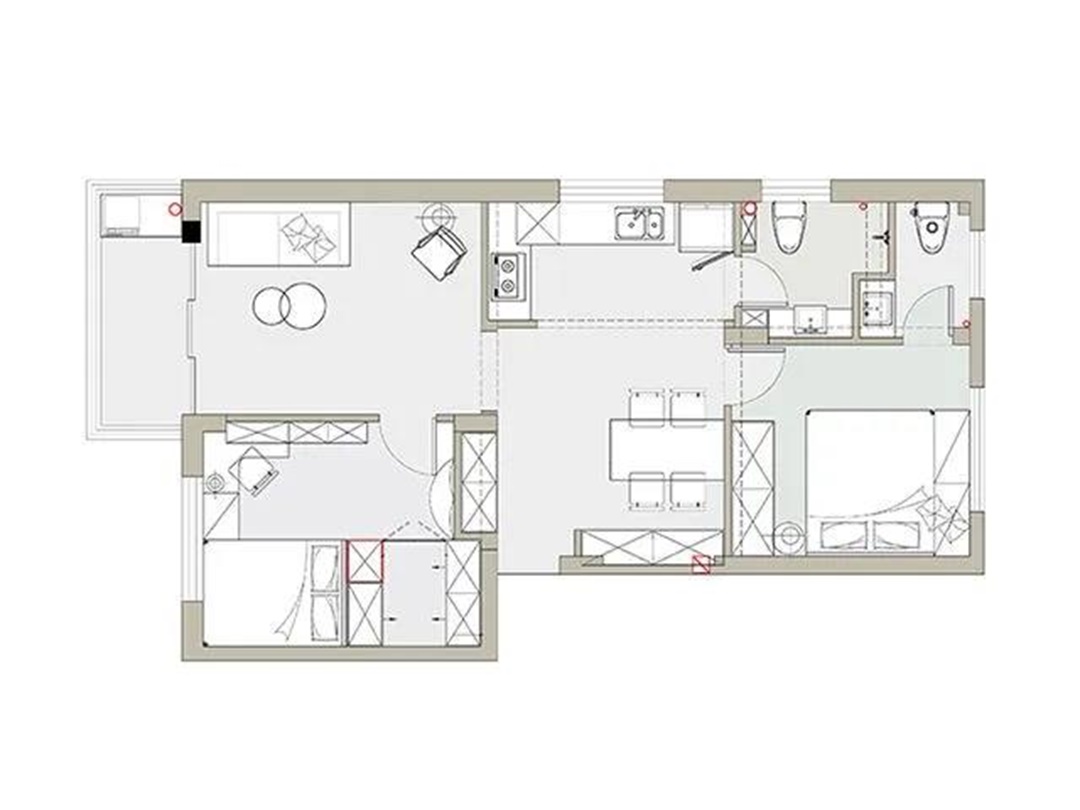 業(yè)主家的戶型比較通透,改造空間大。 如果設(shè)計(jì)三居室,房間就會(huì)有點(diǎn)擁擠,所以在次臥放置雙層床,供兩個(gè)女兒使用。在主臥分離出一個(gè)小的洗手間,方便女主人早上洗漱,同時(shí)與客用洗手間區(qū)分開(kāi)來(lái)。