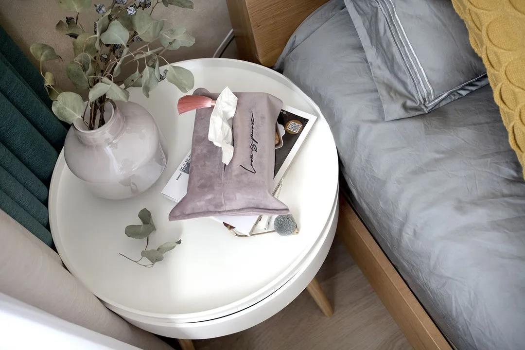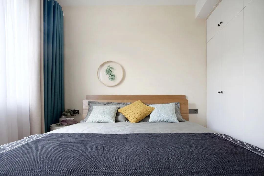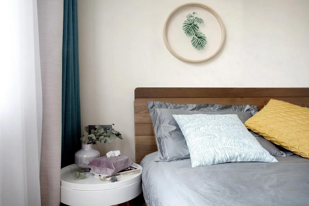 陽(yáng)光微淡,歲月靜好,安然如素。臥室大繁至簡(jiǎn),大量用中性色卻十分溫馨。床頭背景墻用到柔柔的杏色,搭上綠植掛件,清新優(yōu)雅。