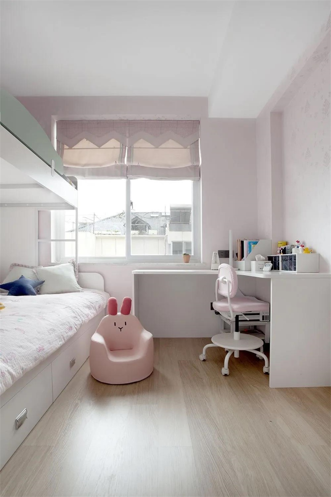 雙層床的的臺(tái)階可以翻開(kāi)抽屜,方便小女孩收納書(shū)籍或小物件。床邊增添一個(gè)小小的衣帽間,從小培養(yǎng)孩子整理自己的禮物,做一個(gè)精致的女孩。