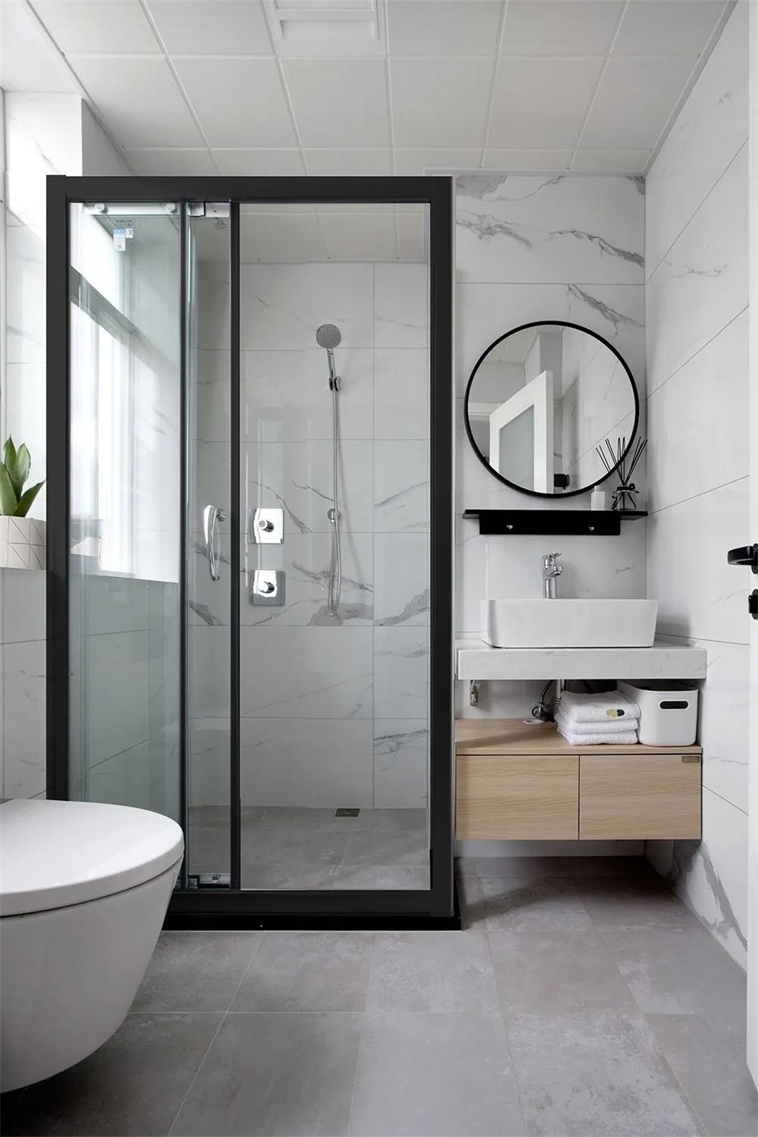 主衛(wèi)采用干濕分離,方便使用。整體黑白色調(diào),很有線條感。大理石紋理墻磚,顯大氣利落。