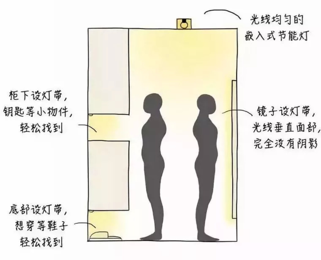 傳統的玄關只裝一個照明燈,作用也只是基礎的照明。人在進出門時候,非常不方便。站在玄關處,上方的光線被遮蓋,找不到鑰匙,看不清鞋子,照不清鏡子......這都是常常發生的事情。