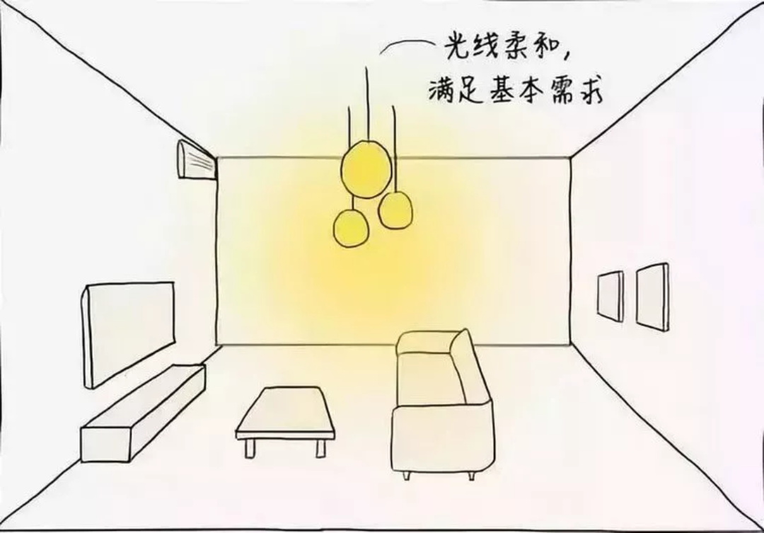 客廳只裝吸頂燈的不在少數,一般位于客廳的正中央。這樣的光源太過于集中,客廳很多區域光線并不好。還可能因為角度問題,造成電視機反光,傷害人眼。