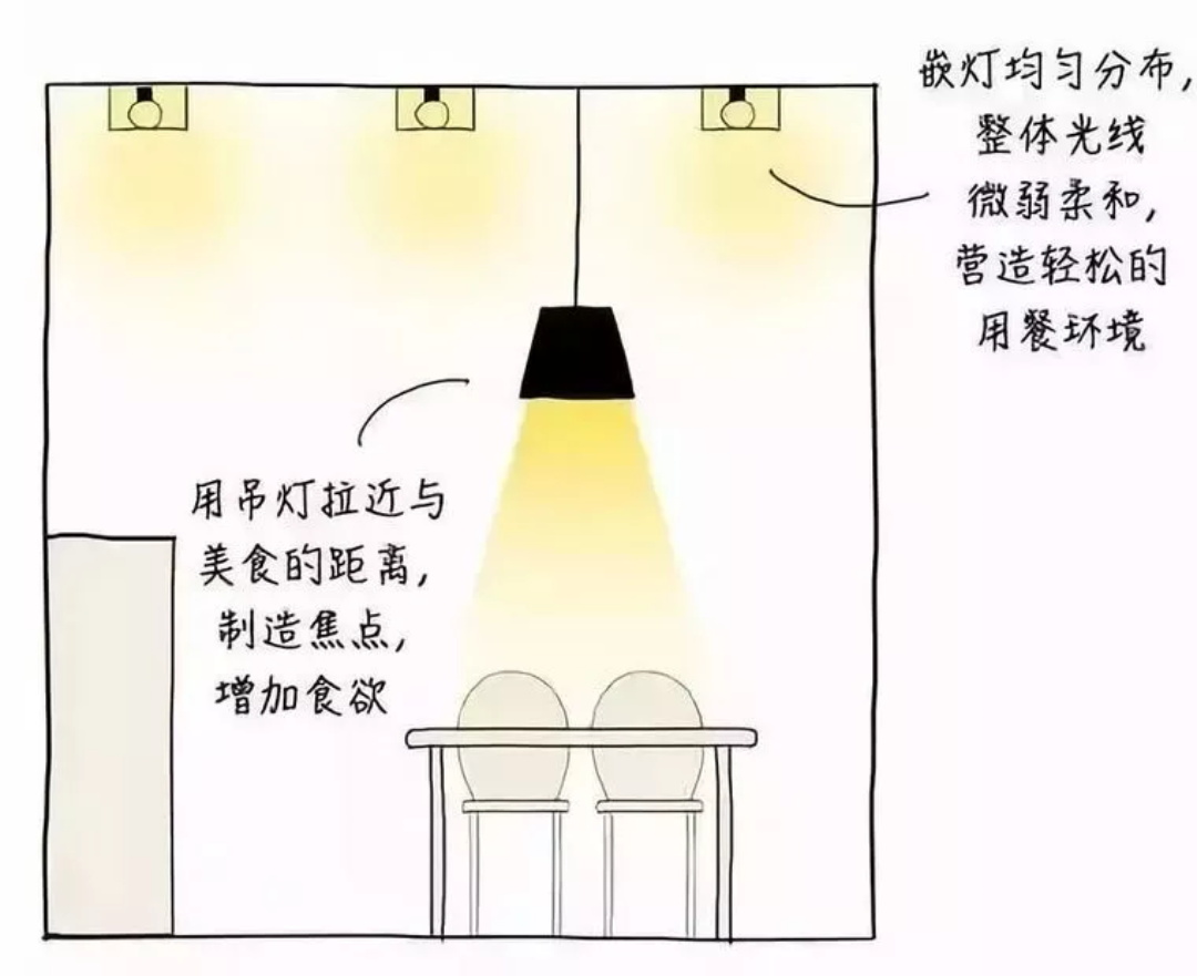 餐廳燈主要是照亮食物和照亮人,普通的單個吸頂燈雖然可以滿足照亮需求,但并不能凸顯出食物和人的氣色。