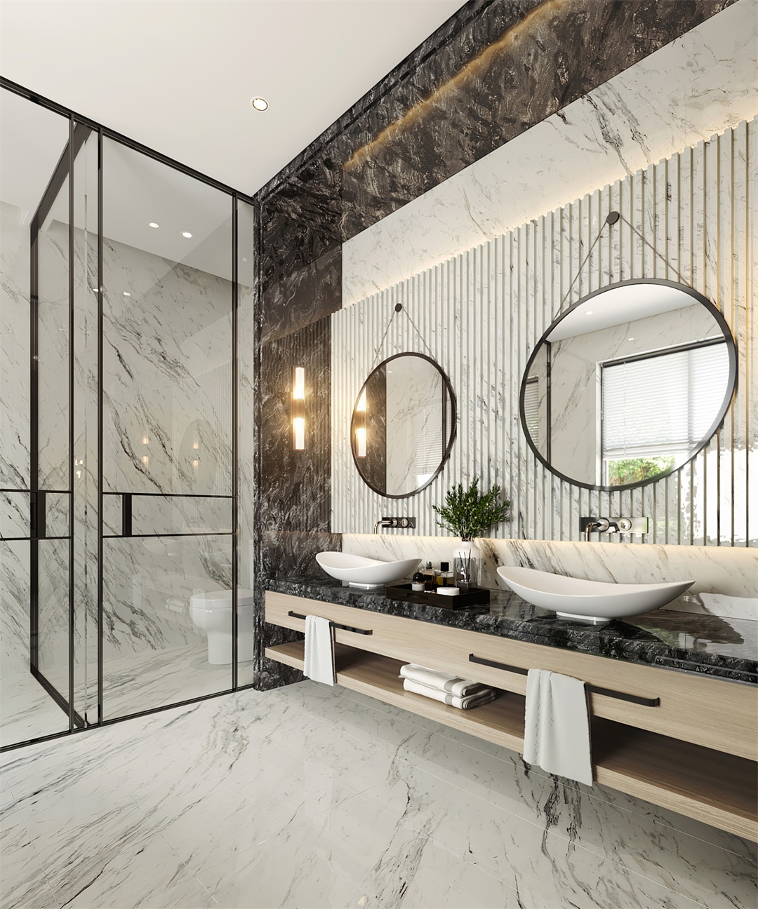 這一塊一般是要做重點照明的,洗漱臺利用壁燈做主要照明,弱化明暗對比。